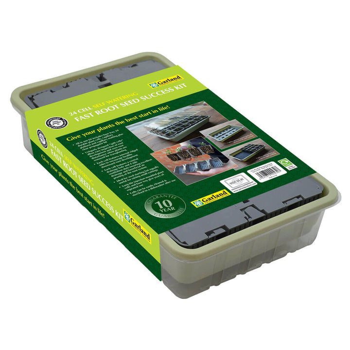 The all-in-one set for all your propagation needs - Garland's 24 Cell Self Watering Fast Root Success Kit. This propagator includes a base tray, 24 durable plant cells, capillary platform and capillary matting, and a clear propagator lid. The innovative 'split cells' allow for easy root development inspection and disturbance-free transplanting. Each cell has internal ridges for healthy downward root growth, as well as a central drainage hole and 4 side ventilation slots to prevent issues like root rot, and to air prune the root system. Perfect for starting seeds or propagating cuttings, these injection moulded cells and tray are long-lasting and can be easily cleaned and sterilised in a dishwasher. Made from 100% recycled and recyclable plastic.